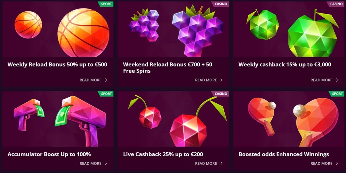 Az oldal két üdvözlő bónusszal fogadja az új játékosokat. Egyet a sportfogadás, egyet pedig a kaszinó játékosok számára szolgálatnak. Mi leginkább a kaszinó üdvözlő csomagot ajánljuk számodra, mivel annak értéke magasabb és még ingyenes pörgetések is tartoznak hozzá. A két promóció közül a regisztráció során kell választani.